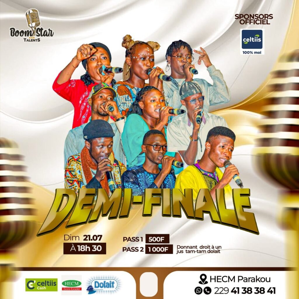 Venez nombreux pour soutenir vos favoris et vivre une soirée inoubliable. 📅 Dimanche prochain, 21 juillet 2024 🕕 18h00 📍 HECM Parakou Billets d’entrée : 500 francs et 1000 francs (un jus Dolait) Boom Star Talents